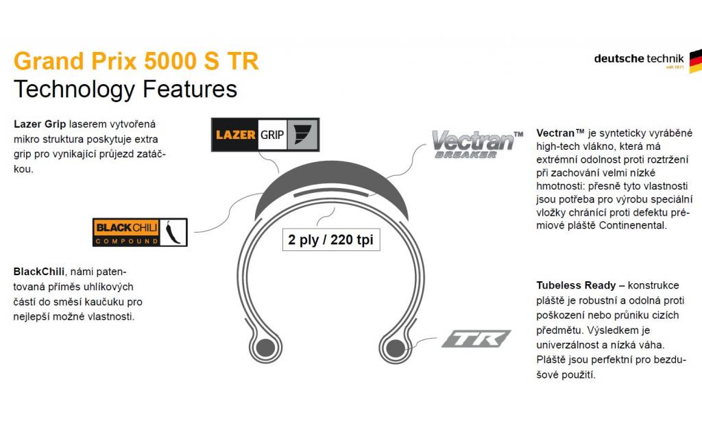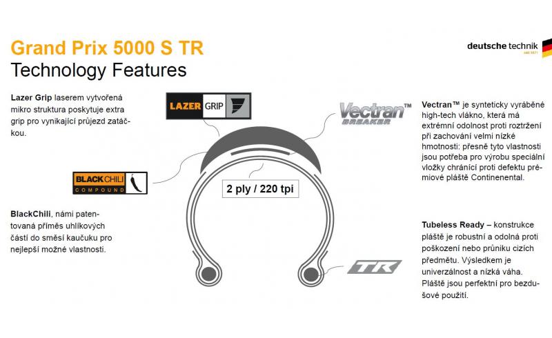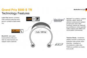 Continental Grand Prix 5000 S TR je vylepšená bezdušová verze nejlepšího silničního pláště Grand Prix 5000, kompatibilní nově i s Hookless ráfky. Ve srovnání s předchozí generací nabízí o 20% rychlejší odvalování, má o 28% lepší ochranu proti defektu díky třem vrstvám na bočnici pláště a o 50 gramů nižší hmotnost díky nové konstrukci.